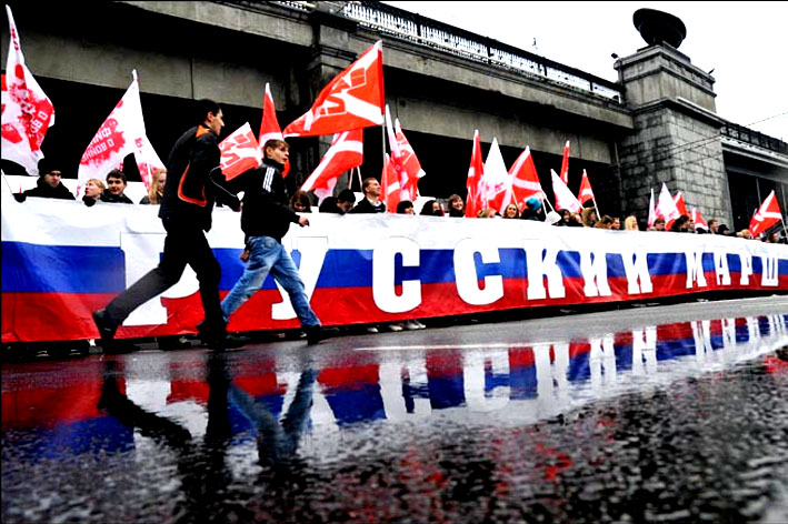 В современной россии под знаменами бело-сине-красных флагов проходят «Русские марши», участники которых выкрикивают нацистские и антизападные лозунги, а так же призывают к дальнейшему «отвоёвыванию» территории других стран, принадлежащей странам СНГ и НАТО.
