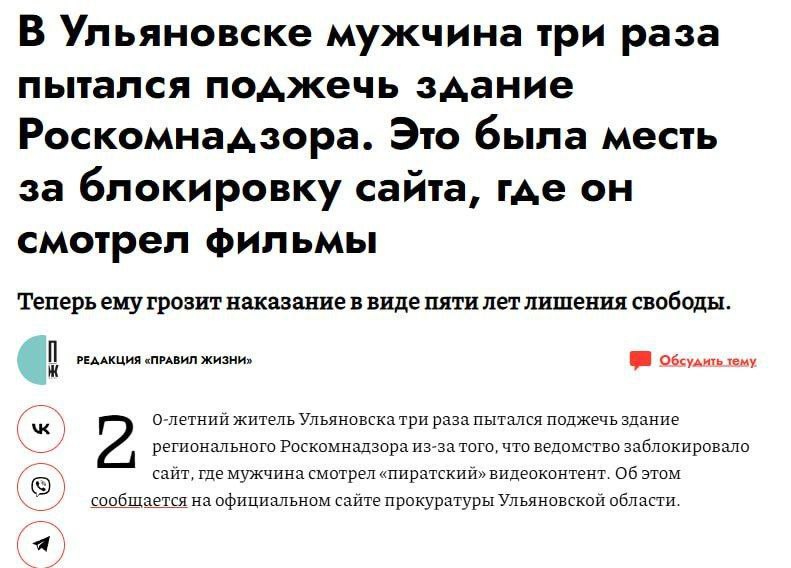 22-летнему Роману заблокировали его любимый сайт с пиратскими фильмами прямо во время просмотра. У Романа появилось много свободно времени, он трижды приходил к офису РКН с молотком, разбивал окно и поджигал офис. Лучше бы россияне так протестовали против войны в Украине и уничтожения Путиным и его олигархами самой России. Так и вымрут в нищете рекордными темпами за просмотром фильмов и лапши с федеральных каналов