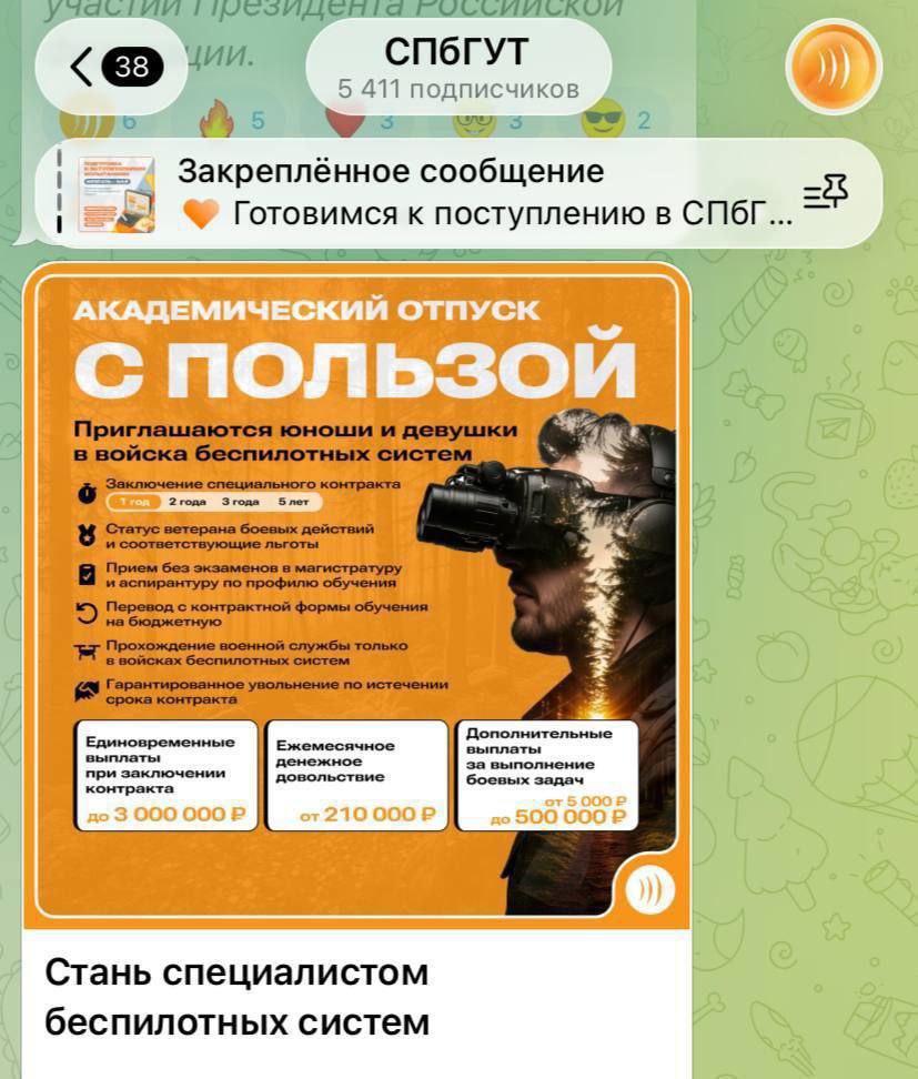 В Санкт-Петербурге студентов и поступающих в ВУЗ агитируют в беспилотные воинские части, обещая разные бонусы за согласие убивать людей в чужой стране. Только вербовщики молчат о том, что операторы дронов сейчас в большой группе риска и вернуться домой невредимым нужно ещё очень постараться. Нормальный человек не пойдет на убийства,, ни за деньги, ни за бонусы.