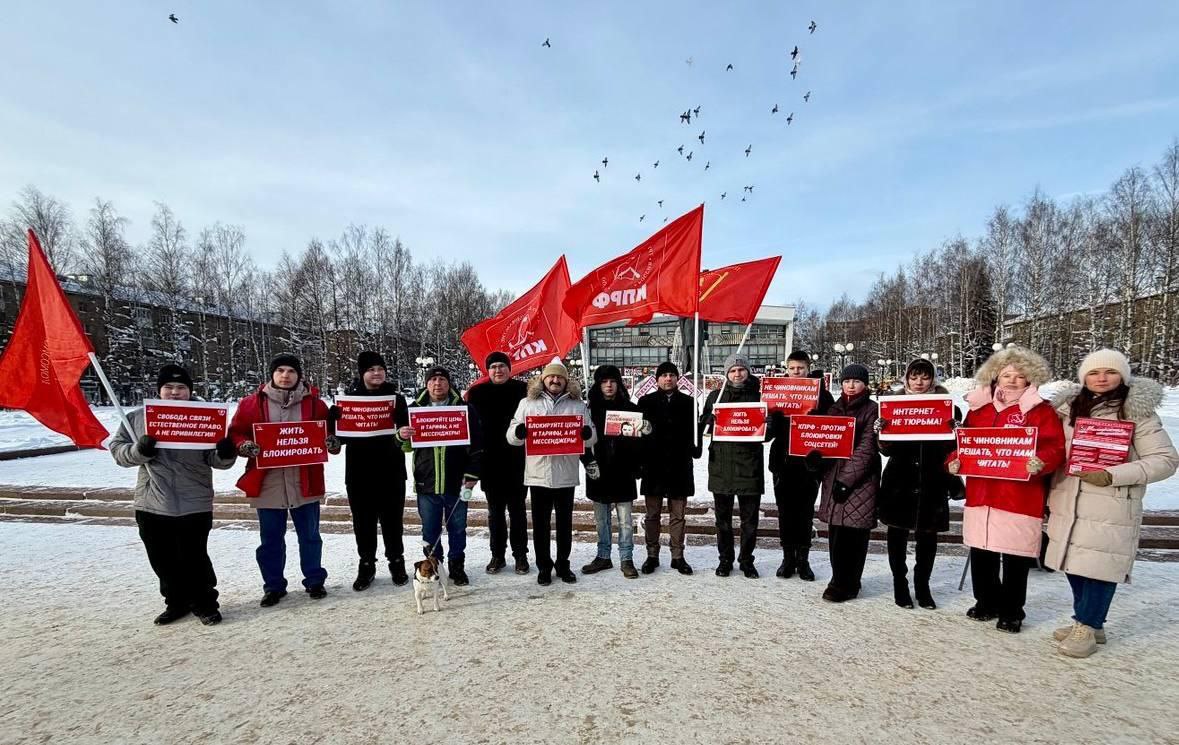 Участники акции стояли с плакатами «Не чиновникам решать, что нам читать», «Блокируйте цены и тарифы, а не мессенджеры» и «Интернет — не тюрьма».
